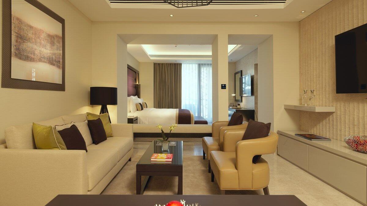 Pokoje Grand Deluxe jsou oproti základním typům pokojů větší o 4 metry čtverečních, proto je možné v tomto typu pokoj ubytovat dva dospělé a dvě děti, z toho jedno do 5,99 let a druhé do 11,99 let max. s jednou přistýlkou. Celý prostor o 49 metrech čtverečních, k němuž přiléhá balkón, má klasický styl, který ozvláštňuje skleněná opískovaná posuvná stěna s arabeskovými vzorem mezi obývací částí a koupelnou. Pokoj má plné vybavení jako všechny ostatní typy ubytování, nechybí rychlovarná konvice, sejf na laptop, pracovní kout s bezplatným wi-fi připojením, nespresso strojek, denně jsou na pokoj doručovány noviny. Některé pokoje  lze propojit s dalším pokojem typu Deluxe, za příplatek je možný výhled na moře.