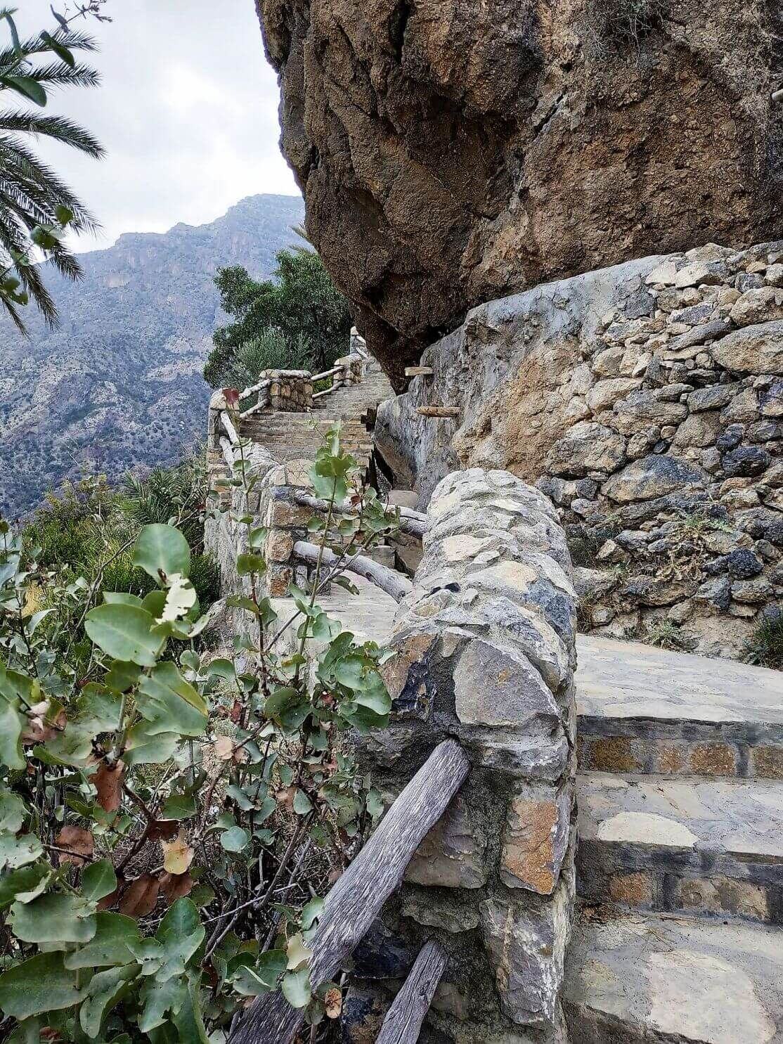 Celodenní výlet začíná v Bílém údolí plném zeleně, kde lze sledovat práci místních farmářů i pasoucí se velbloudy. Džíp pak vystoupá až do výšky tisíc metrů do vesnice Al Abyadh, v níž jsou starověké domy doslova zavěšeny na skalách. Její obyvatelé shlížejí na jedné straně na údolí s mělčinami, které lemují písečné duny, zatímco naproti se jim otevírá výhled na skalní horské masívy. Výlet pokračuje do vesnice Wakan, kde lze pozorovat hospodaření na horských terasách, malebnost tohoto koutu země vyniká zejména na jaře, kdy svahy zalije smršť bílých a růžových květů. Sousední Wádí Mistal s dramatickými kaňony celkový dojem prohloubí. Závěr cesty patří předislámskému městečku Nachl, které obklopuje palmová oáza a pevnost, přírodní horké léčivé prameny jsou po cestě určitě příjemným osvěžením. V ceně výletu je zahrnuto vstupné, za příplatek lze objednat piknikový koš.