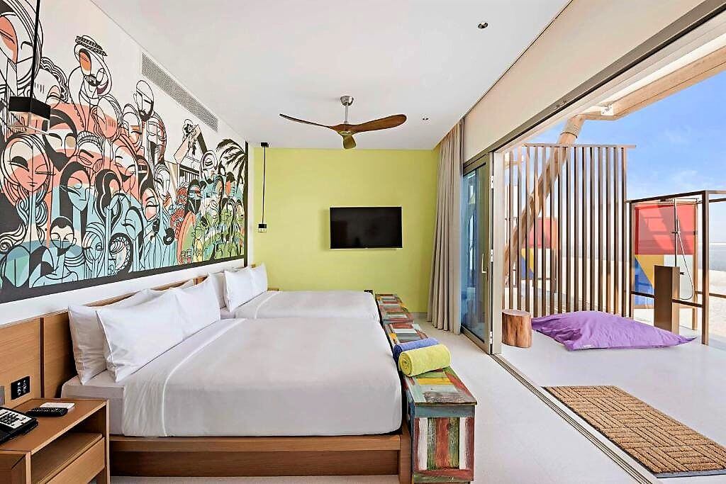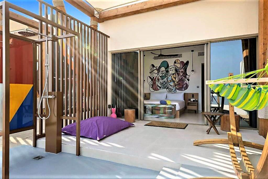Tento typ pokoje na pláži vřele doporučujeme. Nejenže je z  manželské postele výhled přímo na mořskou hladinu, ale k dispozici je také krásně vybavená terasa s venkovná sprchou a hamakou, prostor o 36 metrech čtverečních, stroj na espresso a koupelna s umývadly pro něho a pro ni. V tomto typu pokoje je možné ubytovat max. dvě osoby, ale pokoje tohoto typu lze v případě čtyřčlenné rodiny propojit, takže každá dvojice má vlastní sociální zařízení.  Tento typ pokoje je možný také v dražší verzi twin, kdy každá osoba má k dispozici postel amerických rozměrů.