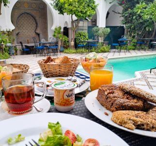 Jelikož je servis v paláci velmi osobní, je možné si snídani nechat naservírovat např. na svou terasu, případně k bazénu, v zimních měsících je k dispozici restaurace. Na jídelníčku jsou především marocké speciality. V ceně pobytu je spotřeba nealko minibaru na pokoji. Dietní požadavky je třeba zaslat předem.