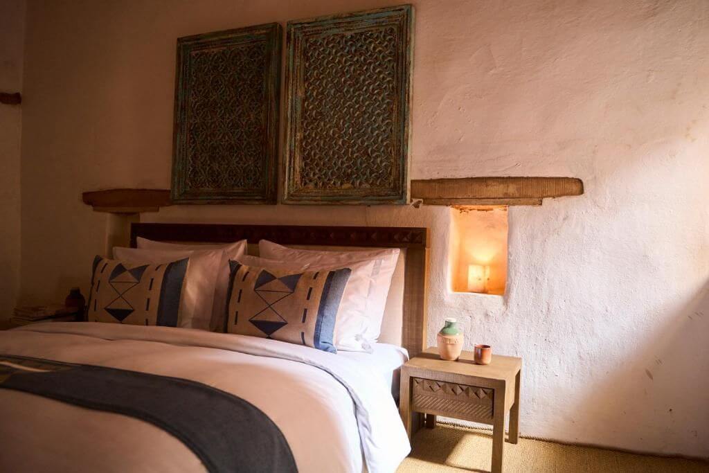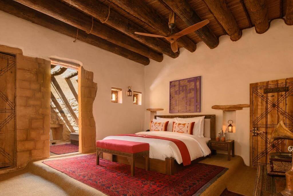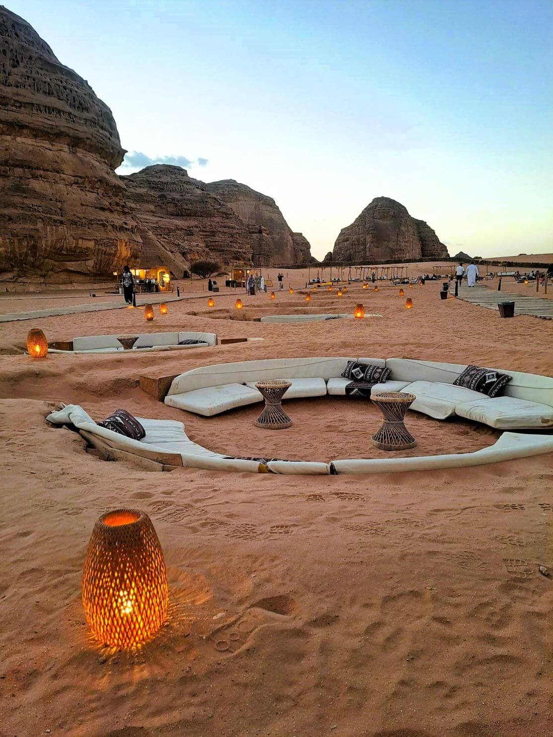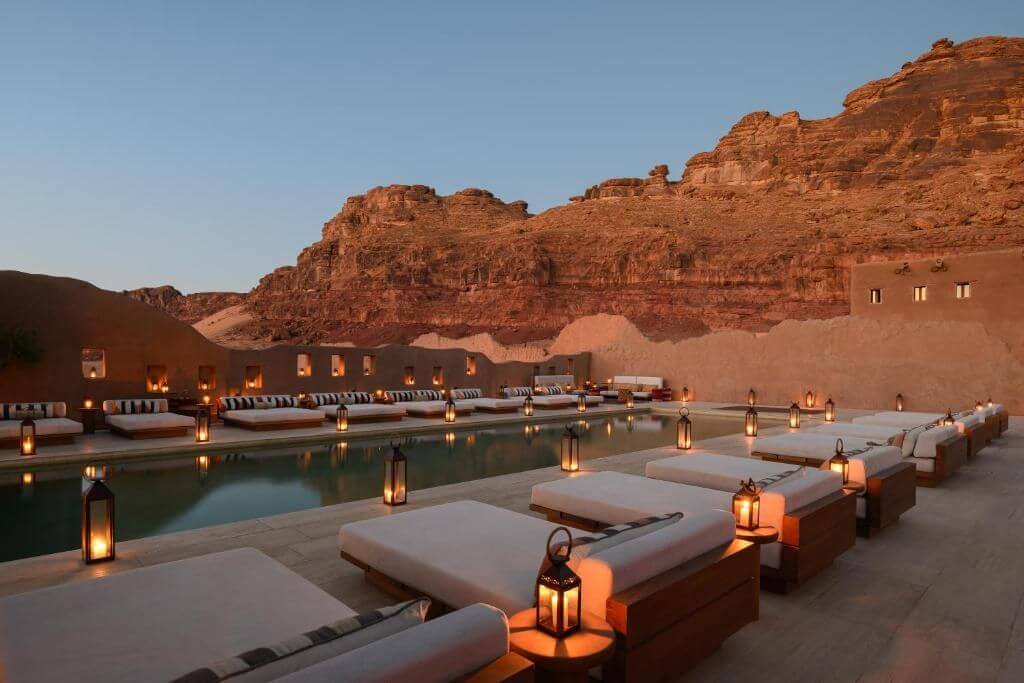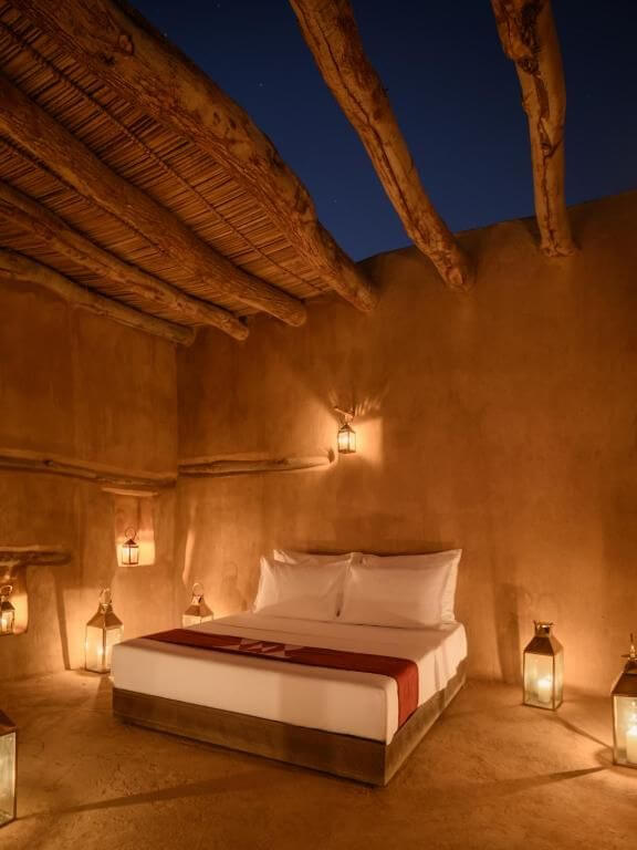 Ubytování je pohodlné a z řady pokojů je možné pozorovat přes otevřený strop hvězdy. Východ slunce je nezapomenutelným zážitkem pro milovníky jógy a nekonečný bazén otvírá výhledy do krajiny, která skrývá mnohá tajemství království Dadanu a Nabatejců, kteří odsud vyráželi na dlouhou cestu pouští. V nedaleké Hegře končila slavná hidžázská dráha, monolity či starodávné nápisy na nedalekých skalách zase provokují fantazii.