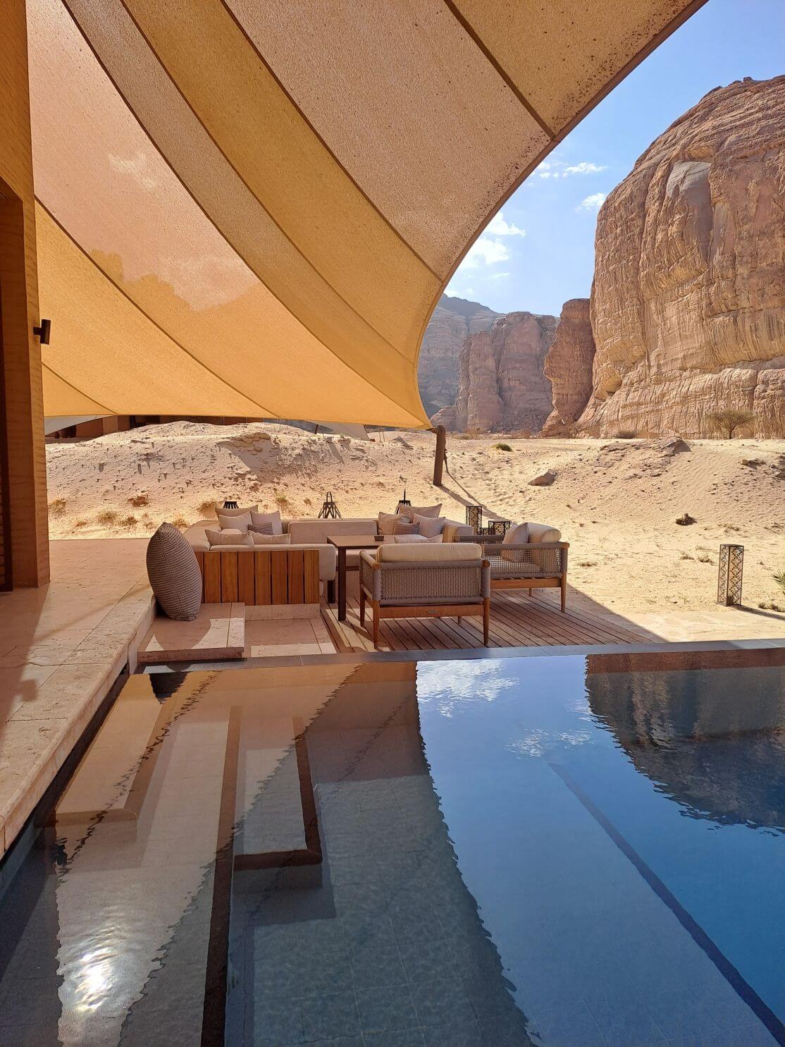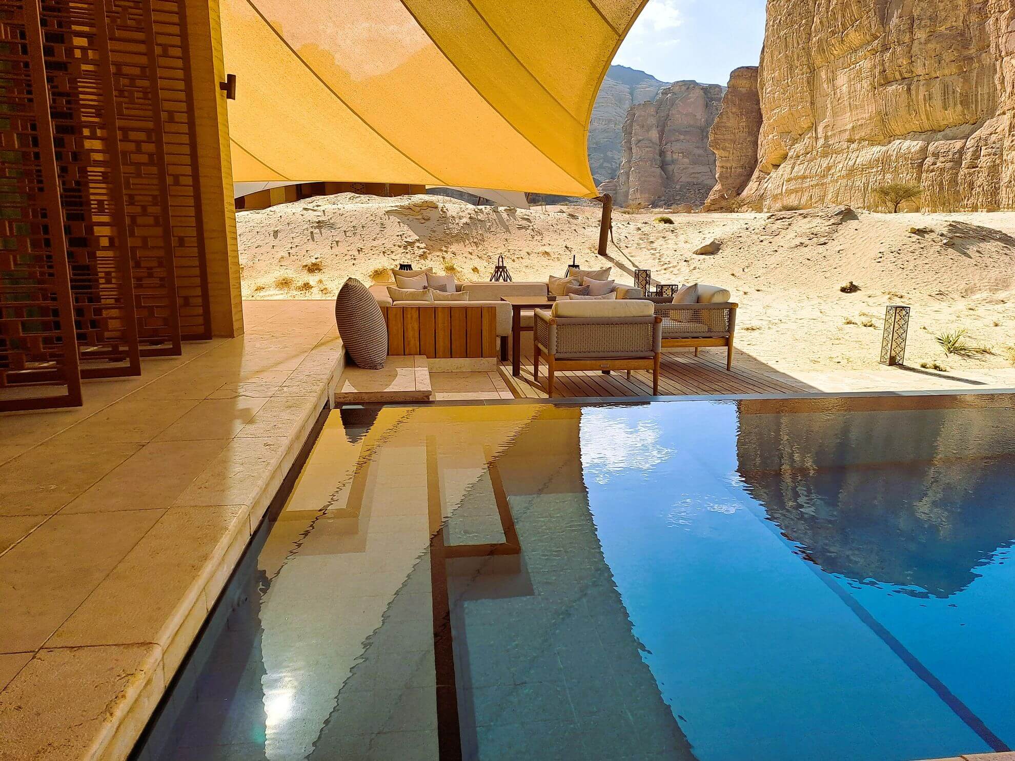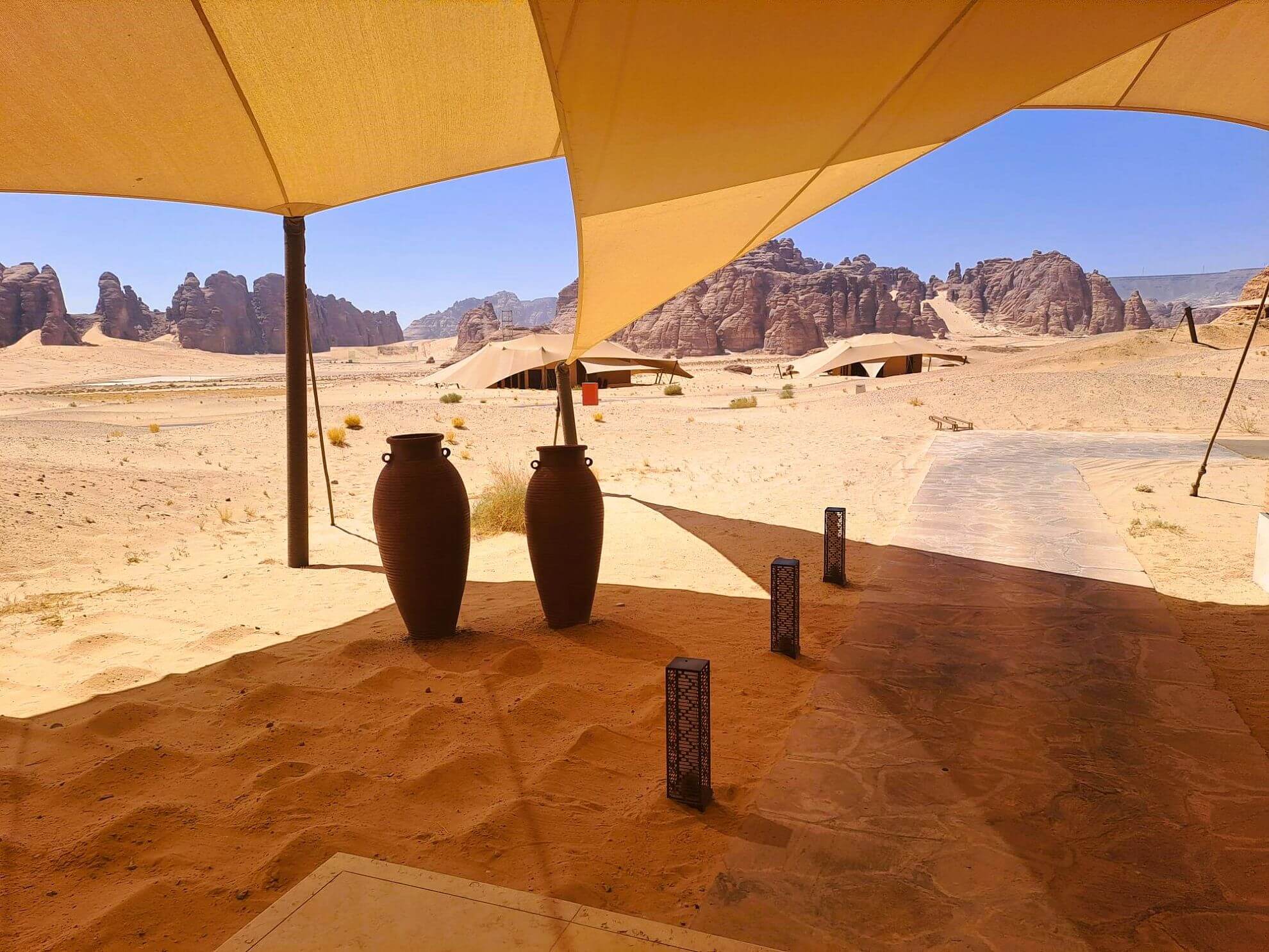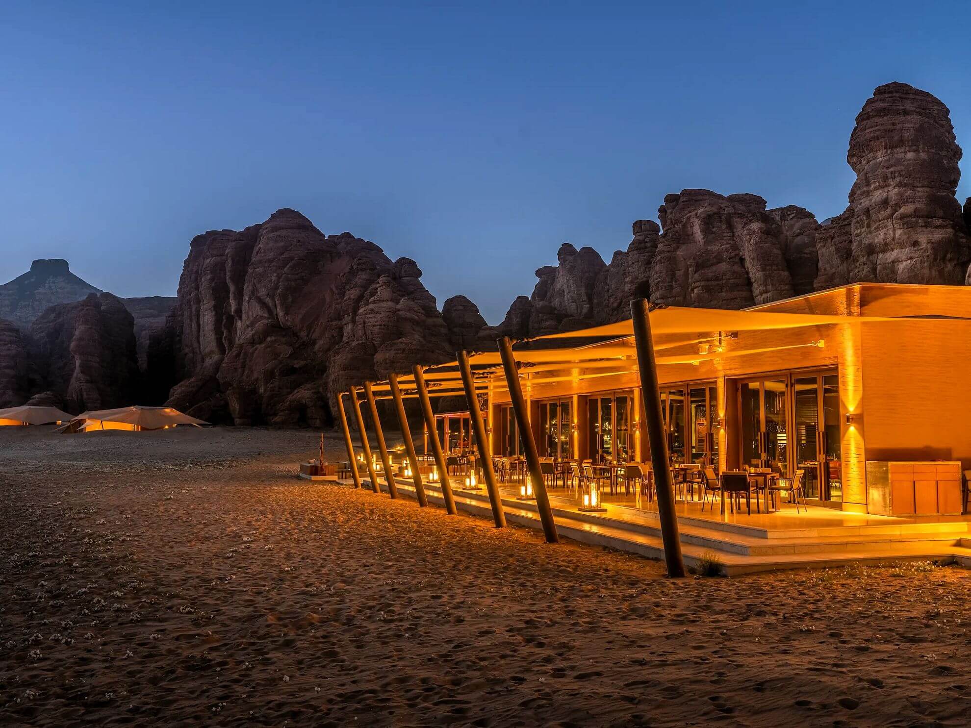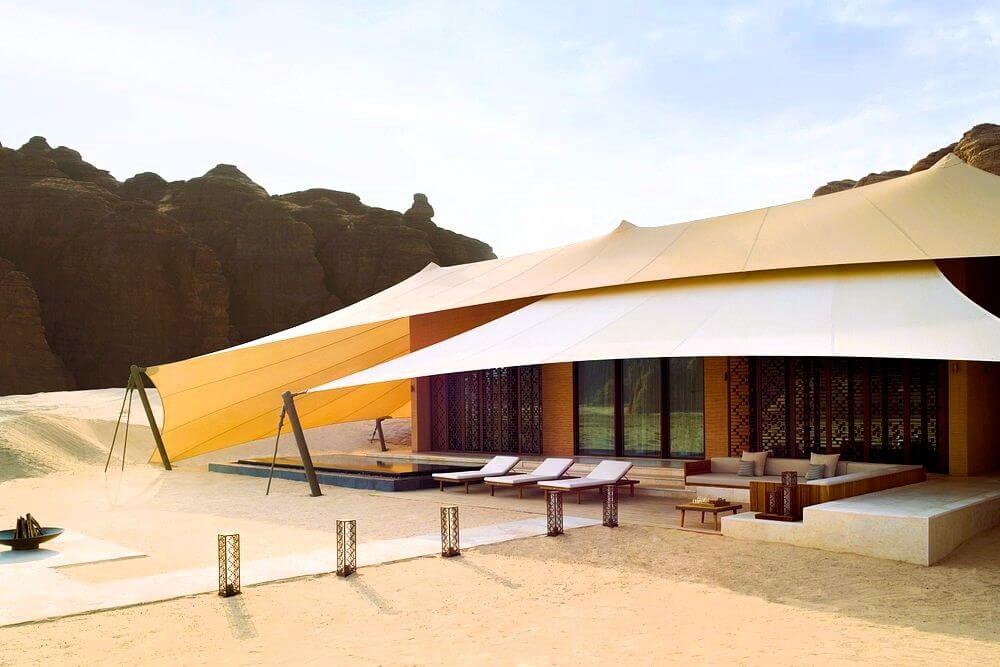 Údolí Ašar nedaleko Al Uly vypadá na první pohled při příletu stejně jako celé okolí, poušť a bohaté skalní útvary. Při příjezdu po zemi se ale začínají vynořovat střechy 47 velkolepých luxusních vil ve tvaru stanů, jejichž barva dokonale splývá s okolím, to je Banyan Tree. Architekti udělali vše proto, aby tento resort korespondoval s krajinou i historií. Na papír jim přitom bylo naservírováno celé údolí, přičemž od severní části resortu s ikonickým bazénem po recepci na konci jižním je to přes tři a půl kilometruy. Každý host se může kochat ve všudepřítomné vůni citronové trávy nekonečnou krásou skalních útvarů od ohniště či bazénu své vilky, kolem níž jsou navršeny písečné duny, což zajišťuje maximální soukromí. I proto do tohoto resortu zamířil např. slavný Ronaldo. Golfový vozík hosta dopraví k úžasnému přírodnímu kamennému bazénu mezi pískovcovými skalami (jen pro starší 16 let), k fata morgáně jménem Maraya, což je největší koncertní budova na světě složená z 9740 zrcadlových panelů, do lázní s medovými a kurkumovými procedurami i do obou skvělých restaurací. Harrat promlouvá k hostovi všemi smysly od nabídky mezze, mořských plodů po místní grilované speciality. Thajská restaurace Saffron je značkovou lodí hotelů Banyan po celém světě, její mistrovské kousky si host může zkusit uvařit během kurzů vaření.