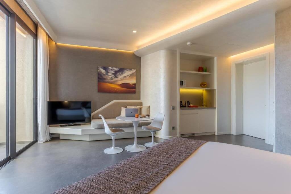 Apartmá, které tvoří ložnice s odděleným velkým obývacím prostorem a balkónem s výhledem na živou promenádu, má celkou 44 metrů čtverečních. V pokoji je možné ubytovat max. 3 osoby.