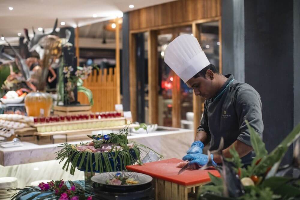 Hosté vítá náhrdelníkem přívětivý personál, který tvoří s velkou převahou lokální obyvatelstvo, který považuje pohostinnost za součást své kultury, a tak se snaží maledivskou zkušenost přenést i na klienty. Prvním dotykem v tomto smyslu je hned 7 různorodých restaurací a dva bary, z nichž ta hlavní pořádá maledivské večery, na čaj můžete ale zamířit i k místní rodině během výletu na lokální ostrov. Přirozená laskavost se promítá do péče o děti, a to jak v rámci hlídání dětí, tak v rámci programu dětského klubu. Smysl pro detail se projevuje snahou personálu nevtíravě hosta zapojit do mnoha aktivit. K nim patří ranní aquagymnastika, jóga, nabídka vodních sportů včetně kajaků s proskleným dnem nebo katamaránů, potápění, rybaření, zmíněné výlety či večerní ohňová show. Romantici ocení plovoucí snídaně, masáže, projížďku na kolech (za příplatek) nebo romantické západy slunce na lodi.