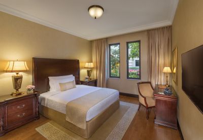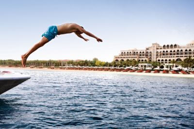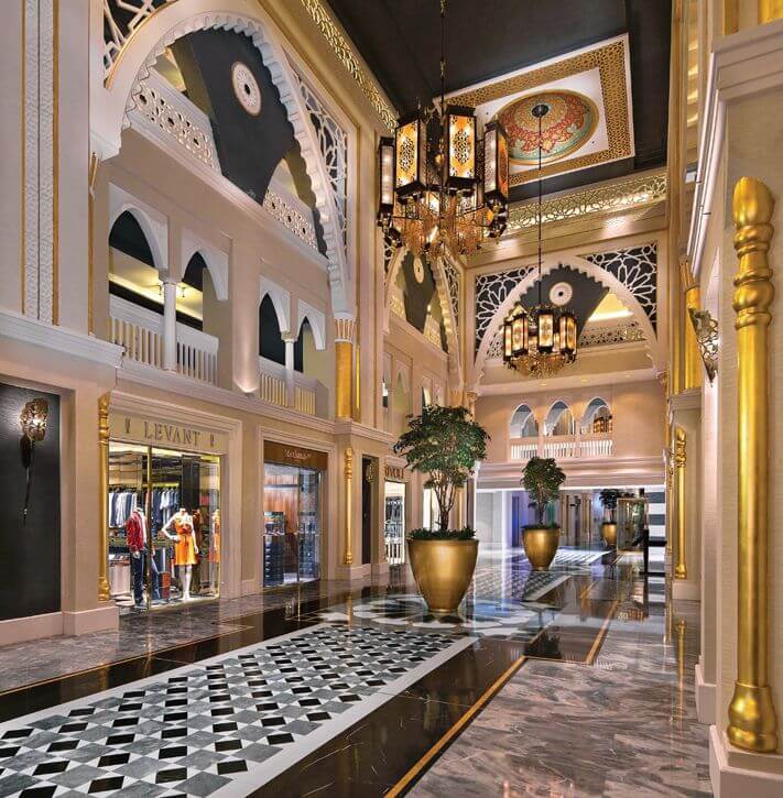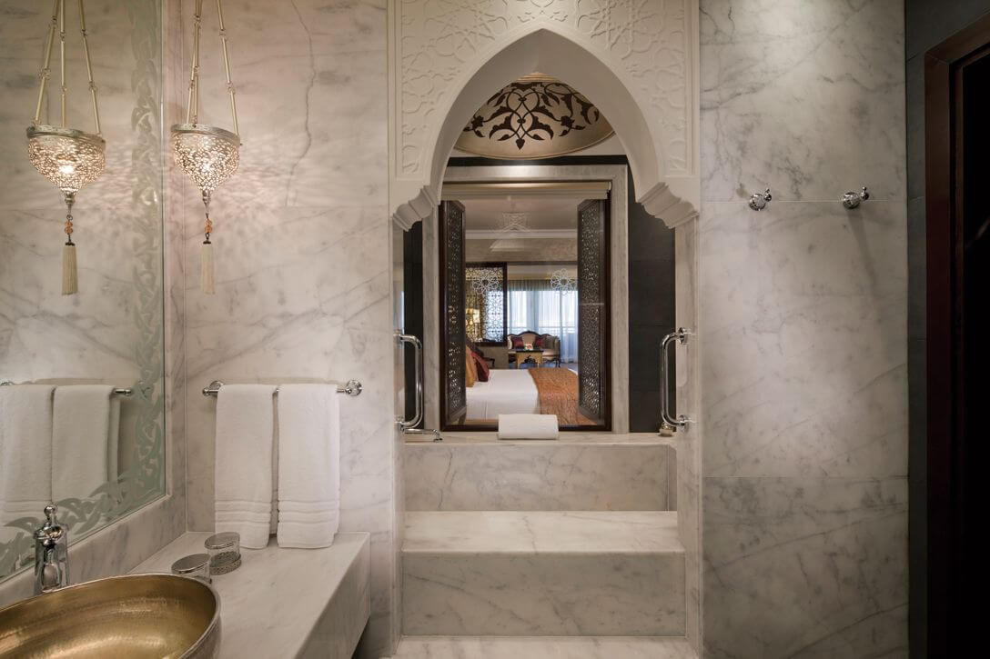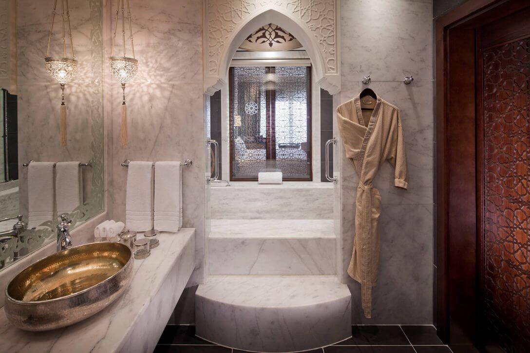 This hotel on Dubai's Palm Island shines like a distant jewel at night and looks opulent from the first moment. It is supposed to commemorate the best of the Ottoman Empire, which is reflected in the entrance and in the ubiquitous hand-painted frescoes. The Turkish style can be also seen in the Turkish baths, in furniture details, Turkish sweets and Anatolian cuisine. Jumeirah Zabeel Saray is one of the absolute top properties in Dubai.