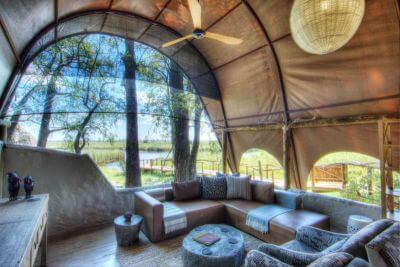 Okuti comprises of five very spacious twin and double-bedded “Masasas” (ancient tribal word for house of reeds), exceptionally unique in style and architecture all rooms overlook the permanent Maunachira channel. An additional two family “Masasas” consist of two bedrooms which share spacious bathroom facilities – ideal for families in this child friendly camp. Each en-suite bathroom provides both an indoor and outdoor shower. Connected by raised wooden walkways all areas of camp are wheelchair accessible.