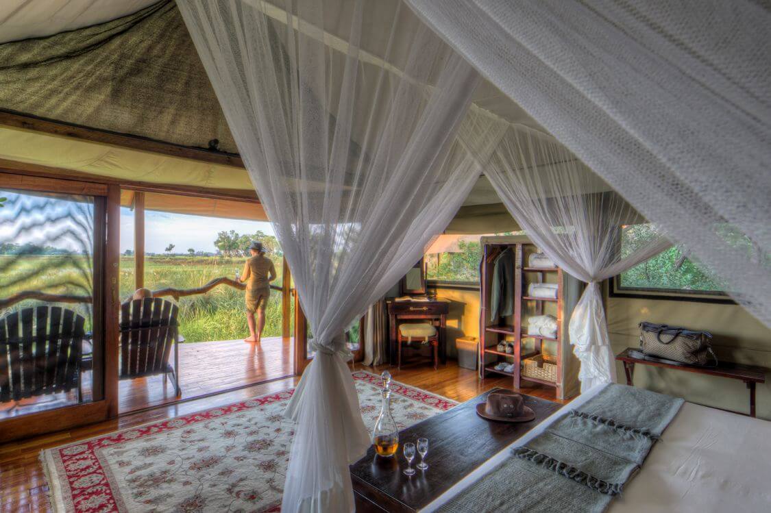 The annual floods transform parts of this concession into a true water paradise, offering guests the best of both worlds. Due to the camps location guests can experience magnificent game sightings during drives as well as the unique experience of exploring the delta’s beautiful waterways by boat or Mokoro. You may actually enjoy the breath-taking spectacle of the water visibly rising around the camp’s raised teak decks. The Sleep Out Deck offers guests the opportunity to spend the night out under the magnificent African night sky.