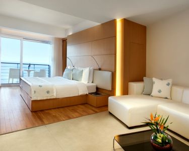 The Junior Suite has a living area with a sofa and guests also have free internet access and a minibar (replenished every a day). The bathroom is separated from the living area by a glass wall, including luxury cosmetics, ironing set available on request. The Junior Suite can accommodate up to two adults and one child under 11 years old. Three adults cannot be accommodated in this room type. Four rooms of this type are located on the ground floor with garden view and partial sea view.